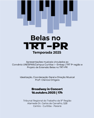 No dia 16 de outubro de 2025 (quinta-feira) as 17h acontecerá o sexto concerto da temporada 2025 do projeto de extensão Belas no TRT-PR vinculado ao convênio de cooperação cultural Tribunal Regional do Trabalho do Paraná e a UNESPAR/Campus Curitiba I - Embap.